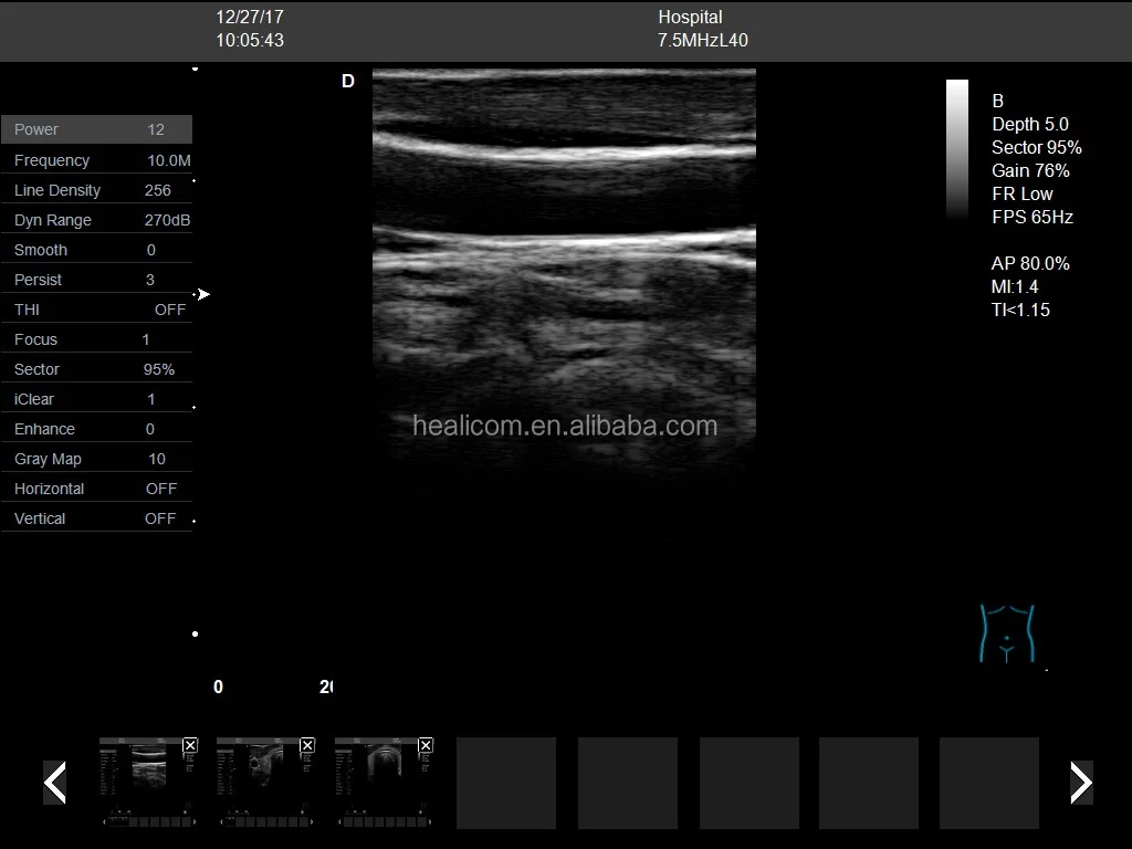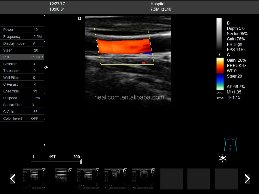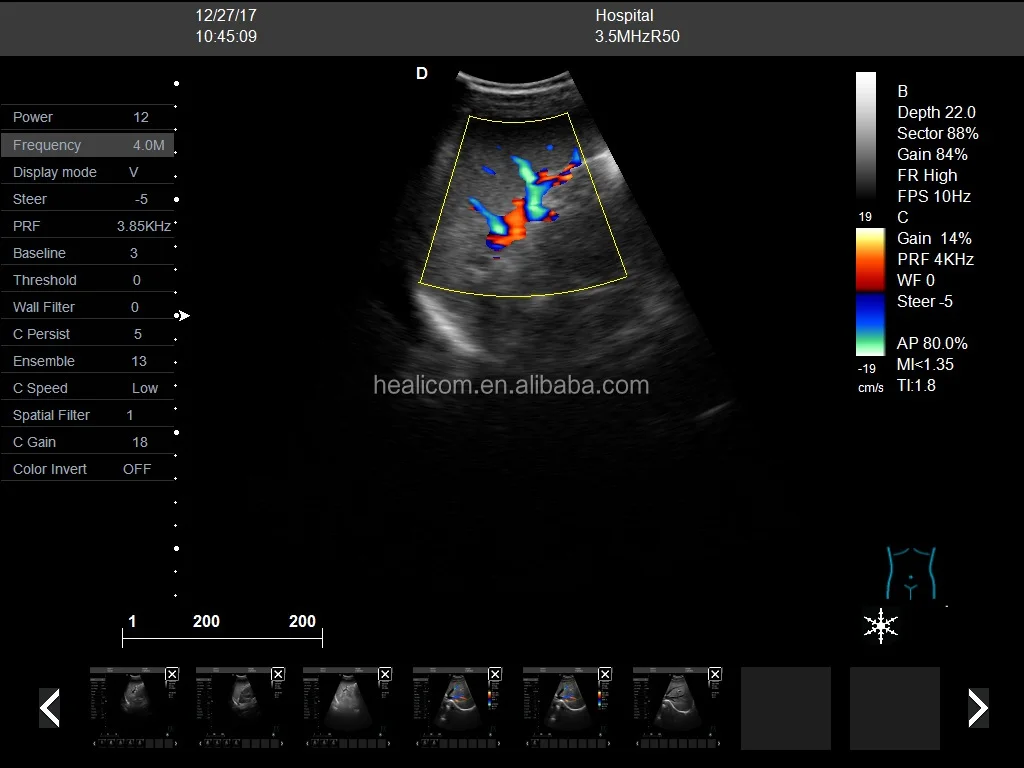 | Image processing | Image persist THI Speckle-reduction Color coder Power adjustable Multi-frequency Smoothing function Edge enhancement Image optimizing disposal One-key optimization Probe mark Image conversion Up/down conversion Left/right conversion Doppler Sound output volume adjustable Wall filter adjustable Base line adjustable Sampling frame adjustable Area changeable(angle changeable) Spectrum sampling volume adjustable Spectrum sampling volume angle adjustable PRF adjustable Image processing |