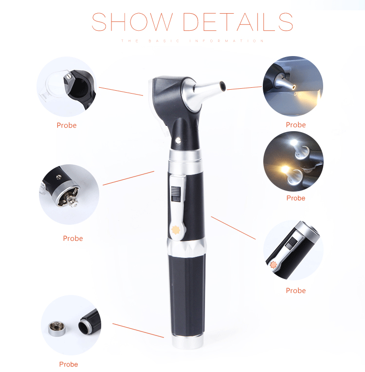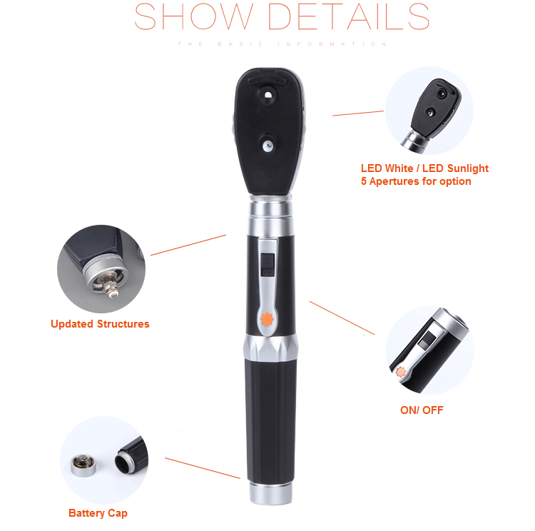Professional Lens System , New LED Technology: LED Sunlight / LED White Bulb for option , 5 Different Apertures , Range of lenses: -20D~+20D , Optional Rechargeable Handle , 4 more colors for option